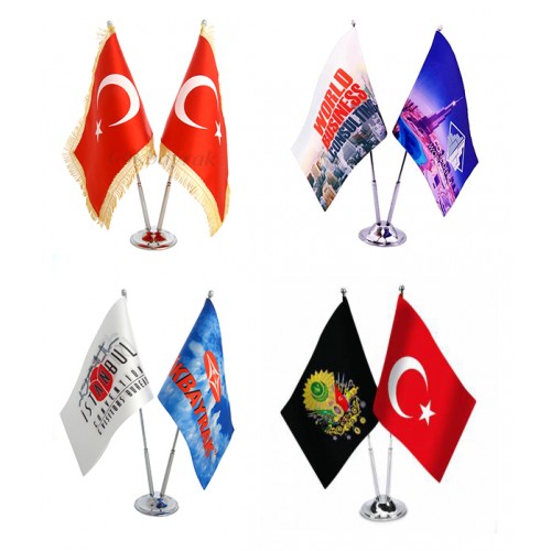 Çiftli Özel Baskılı Masa bayrağı, masa üstlerinde ve benzeri yerlerde kullanılan aksusuardır. Masa üstlerinde kullanmak için tasarlanan, krom veya sarı bir ayak ve çift kat saten bayrağı, ile oluşan özel tasarım, tanıtım reklam bayrağı, kalitesi ve parlaklığı ile şık gözükmektedir. Ürün fiyatı adet miktarına göre değişiklik göstermektedir. Siparişlerinizde çizim programlarında tasarlanmış PDF ve diğer seçeneklerde gönderiniz.3-5 günde tarafınıza teslim için sevk edilir. masa direğinin ölçüsü taban 7.5 çapında yükseklik ise 32 cm olup, masa bayrağı, 15 x22.5 cm standart ölçüdür.
